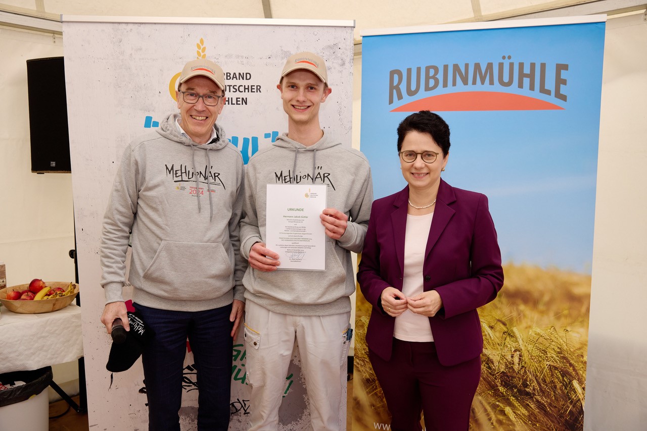 Christopher Rubin, Geschäftsführer der Rubin Mühle und Mitglied im Präsidium des Verbandes Deutscher Mühlen, hob in seiner Laudatio die Bedeutung des Berufs hervor: „Ihr habt bereits Großes geleistet und dürft stolz darauf sein, zu den zwölf Besten Eures Jahrgangs zu zählen. Auch wer heute nicht auf dem Siegertreppchen steht – Ihr alle seid Gewinnerinnen und Gewinner. Ohne Müllerinnen und Müller kein Brot, keine Haferflocken, keine Teigwaren, keine Kekse – und vieles mehr, das aus unserer Ernährung nicht wegzudenken ist. Unser Handwerk ist vielfältig, anspruchsvoll und essenziell. Ihr seid Botschafter der Müllerei. Tragt den Stolz für Euren Beruf in die Welt und zeigt, wie bedeutend unsere Arbeit ist.“